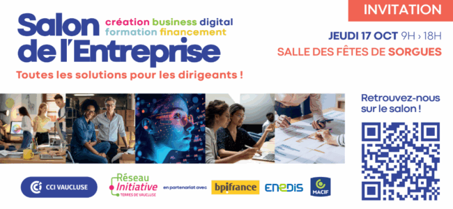 Salon de l’Entreprise, organisé par la CCI de Vaucluse et Initiative Terres de Vaucluse, le 17 octobre 2024 à 15h. Venez nombreux ! 😉